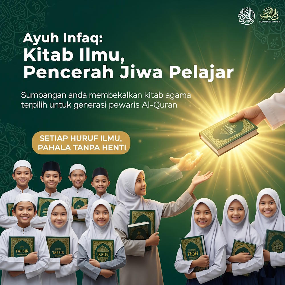 Bayangkan: Senyuman tulus para pelajar mahaad tahfiz di saat kitab tafsir impiannya atau buku-buku agama kini di tangan, atau para pelajar sekolah agama yang semangatnya menyala, kini mampu mendalami kitab hadith dengan naskhah lengkap. Setiap huruf yang mereka baca, setiap ilmu yang mereka serap, akan menjadi pahala berterusan kepada anda.